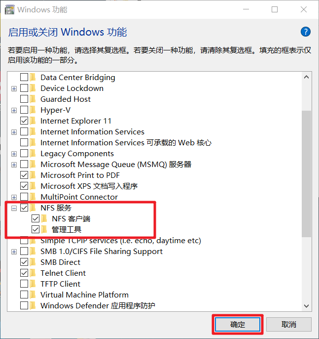 可直接使用windows10 自带的nfs客户端服务功能,打开控制面板>>程序>>程序和功能>>启动或关闭Windows功能